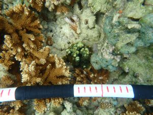 Invasive Montipora cf. stellata growing in Kāne‘ohe Bay near native Montipora capitata.