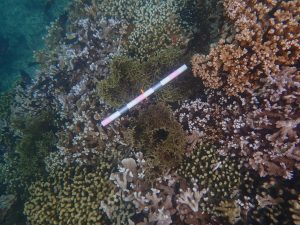 A SNAP survey stick landing on native coral and invasive Eucheuma/ Kappaphycus.