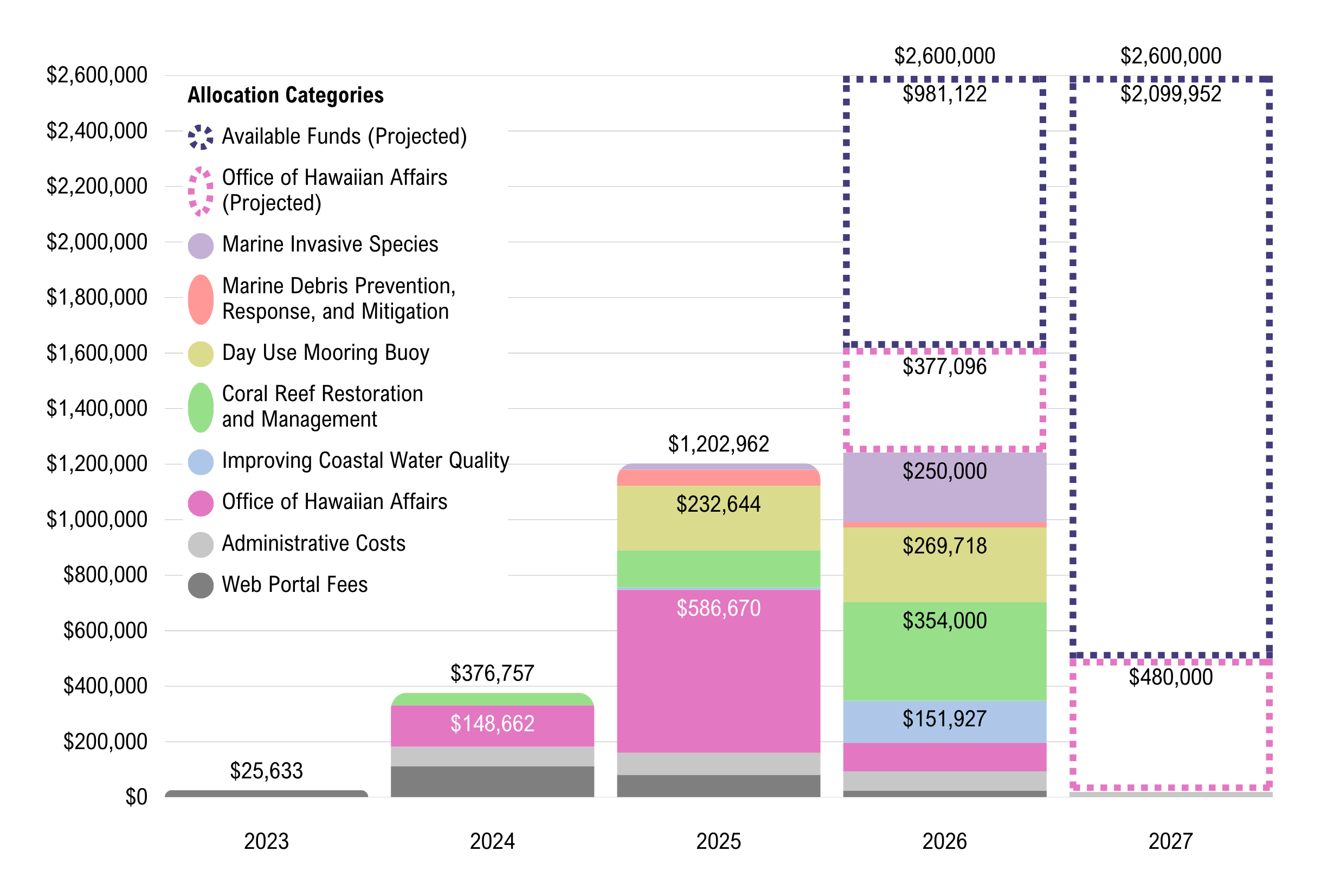 The purpose of the Aloha i ke Kai Ocean Stewardship User Fee Program is to direct funding toward action that enhances the health and abundance of our ocean which benefits Hawaiʻi residents and visitors. A healthy ocean is inextricably linked to a thriving economy and our way of life. Collected fees go into the Ocean Stewardship Special Fund. For more details, please visit our Reports page for annual reports.