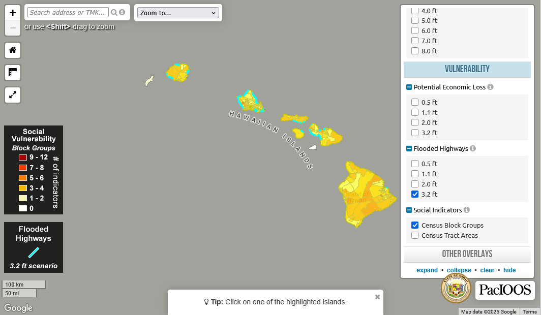 The viewer was developed through partnership between the Pacific Islands Ocean Observing System (PacIOOS); the Coastal Research Collaborative at the University of Hawaiʻi and the University of Hawaiʻi Sea Grant College Program; along with CCMAC, DLNR, and the Hawaiʻi Office of Planning and Sustainable Development. Improvements include expanded data, user-friendly guidance and social vulnerability indicators.
