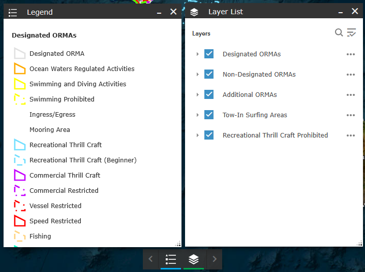 The legend and layer list can be found at the bottom center of the screen. From the layer list, you can toggle which ORMAs you wish to see on the map.
