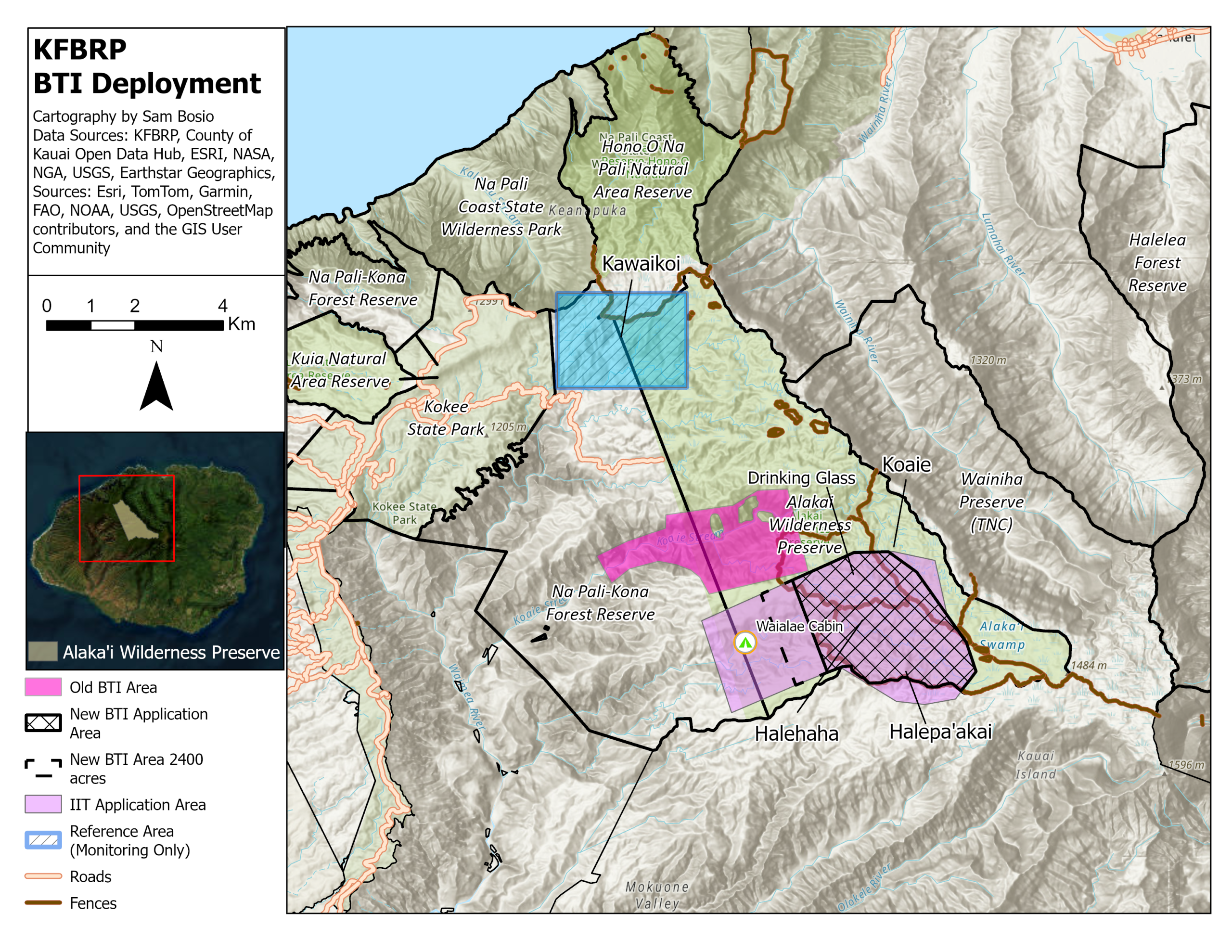 While Bti is commonly applied by hand to small water bodies during ground-based surveys, this approach cannot cover sufficient area to protect ʻakikiki and ʻakekeʻe habitat across the Alakaʻi Wilderness. Aerial application of Bti has been used extensively for mosquito control targeting human disease, and this methodology was adapted in 2023 for Hawaiian forest environments during a pilot treatment covering 270 acres. Preliminary results demonstrated that droplets of Bti applied from helicopter-mounted sprayers successfully reached the forest floor in quantities sufficient to kill mosquito larvae. Additional funding was then secured to expand treatment to approximately 1,000 acres in the mid-Koaie drainage to enhance mosquito and avian malaria control for the protection of native forest birds. Bti treatments in the mid-Koaie drainage were conducted from June 2024 through June 2025.