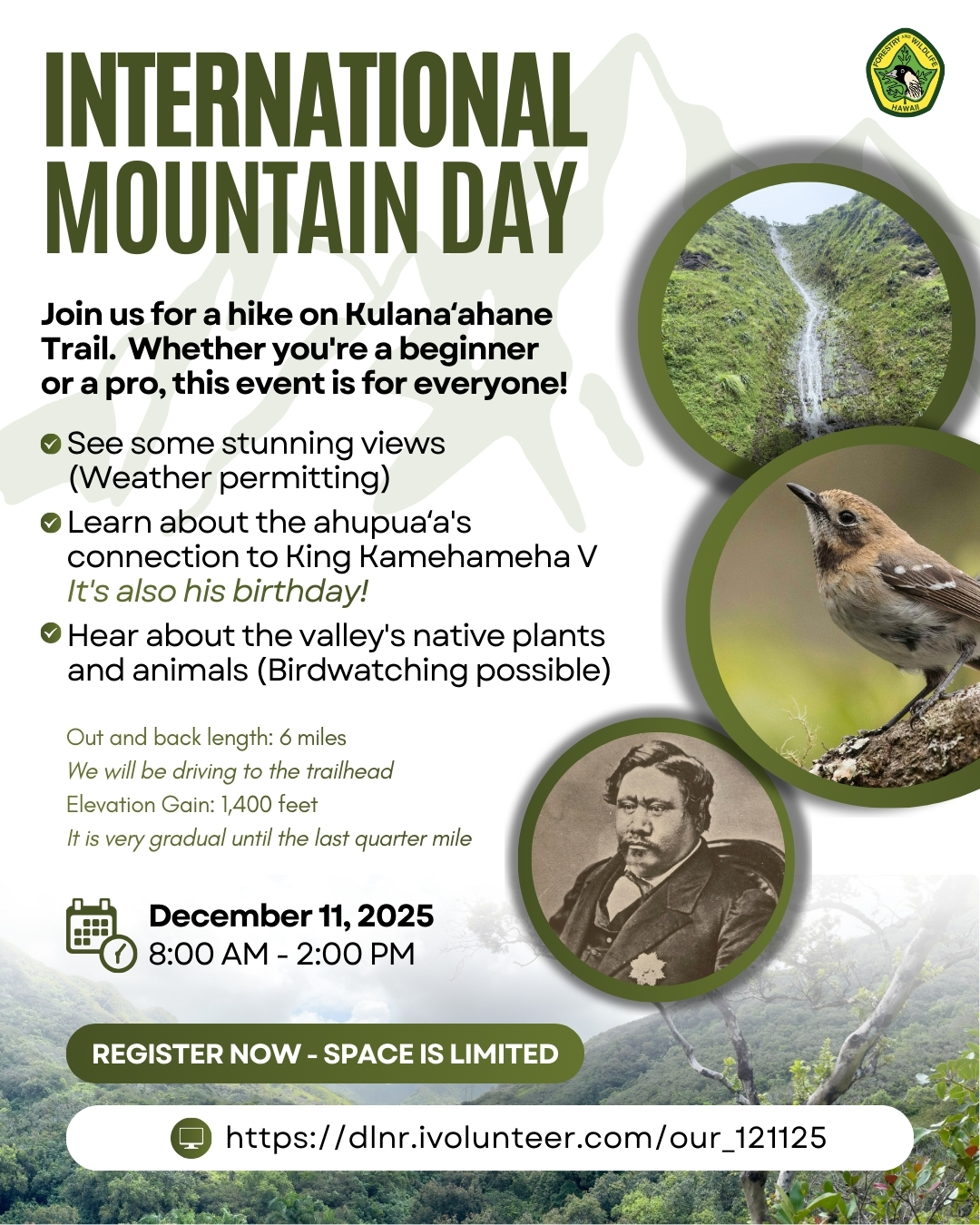 INTERNATIONAL MOUNTAIN DAY Join us for a hike on Kulanaʻahane Trail. Whether you're a beginner or a pro, this event is for everyone! See some studding views (weather permitting) Learn about the ahupuaʻa's connection to… Read More »