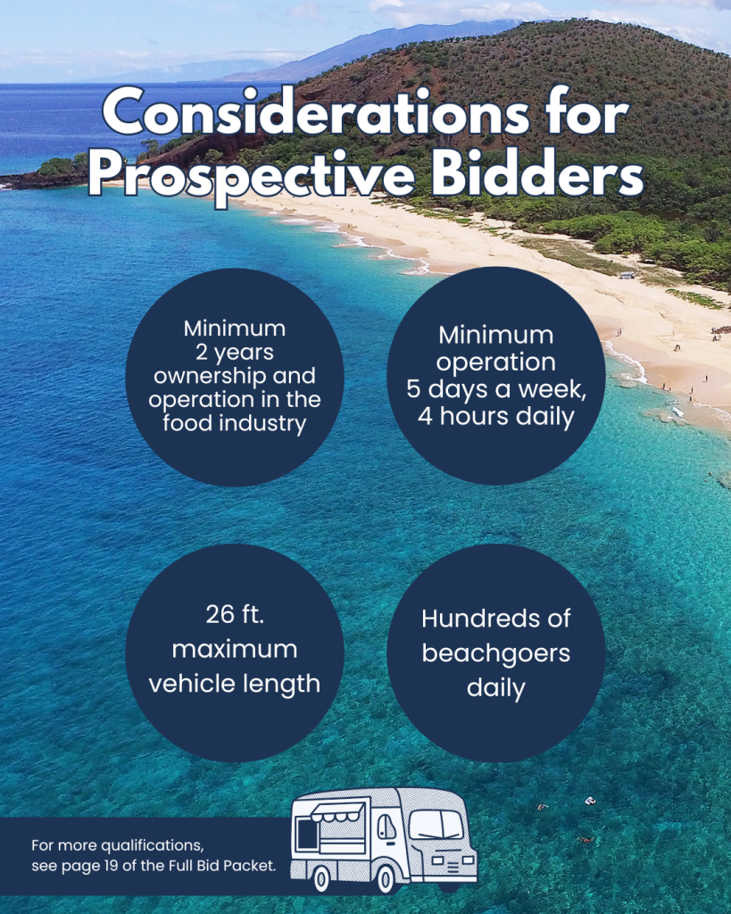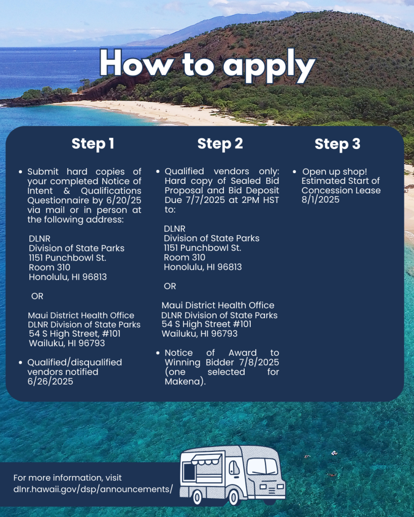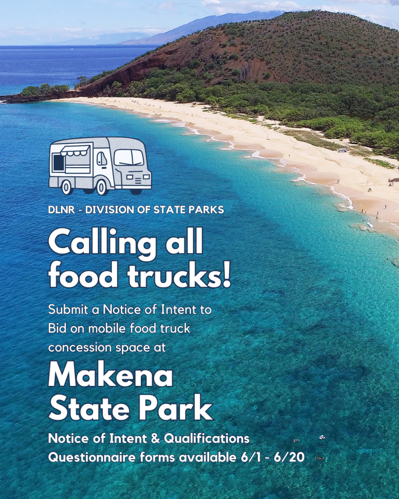 FOOD TRUCK CONCESSIONAIRES SOUGHT FOR MĀKENA STATE PARK DLNR’s Division of State Parks is in search of food truck parties interested in leasing concession space at Mākena State Park. Notice of Intent & Qualifications Questionnaire will be available 6/1/2025 – 6/20/2025 online and at the DSP office in Maui and Honolulu. Submission of these two forms is required to be eligible to move on in the bidding process. Hard copies of the forms must be submitted in-person or via mail, electronic submissions WILL NOT be accepted. ONE winner will be selected.