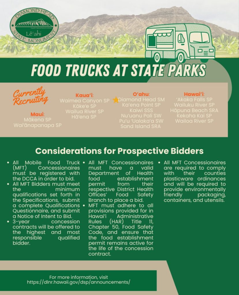FOOD TRUCK CONCESSIONAIRES SOUGHT FOR OUR BUSIEST STATE PARK DLNR’s Division of State Parks is in search of food truck parties interested in leasing concession space at Diamond Head State Monument. Notice of Intent & Qualifications Questionnaire will be available 4/25/2025 – 5/5/2025 online and at the DSP office in Honolulu. Submission of these two forms is required to be eligible to move on in the bidding process. Hard copies of the forms must be submitted in-person or via mail, electronic submissions WILL NOT be accepted. TWO (2) winners will be selected.
