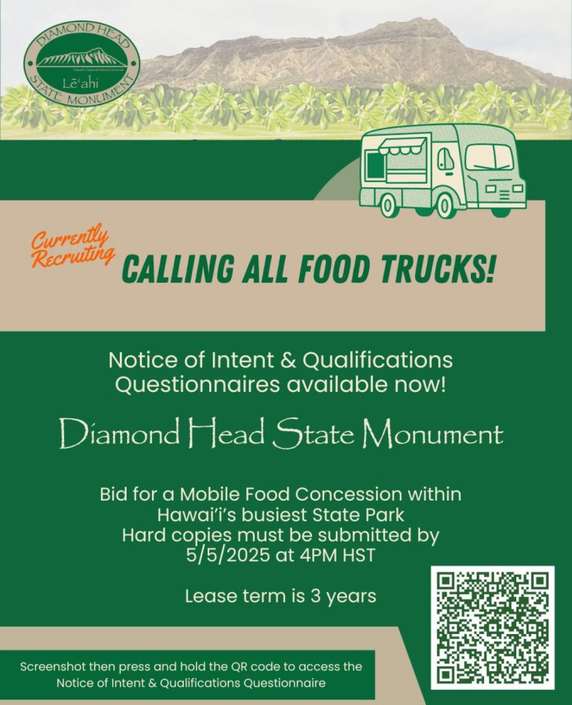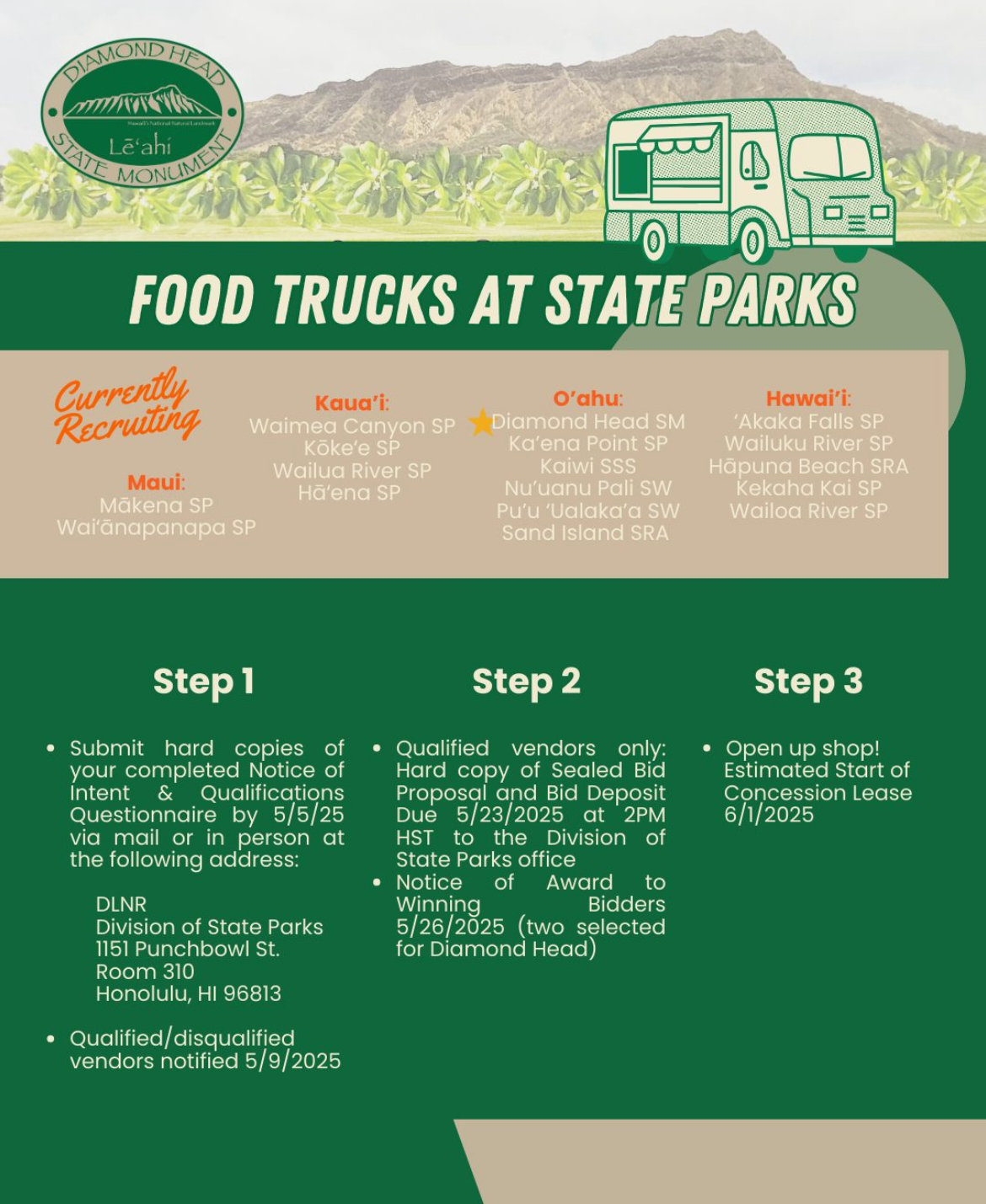 FOOD TRUCK CONCESSIONAIRES SOUGHT FOR OUR BUSIEST STATE PARK DLNR’s Division of State Parks is in search of food truck parties interested in leasing concession space at Diamond Head State Monument. Notice of Intent & Qualifications Questionnaire will be available 4/25/2025 – 5/5/2025 online and at the DSP office in Honolulu. Submission of these two forms is required to be eligible to move on in the bidding process. Hard copies of the forms must be submitted in-person or via mail, electronic submissions WILL NOT be accepted. TWO (2) winners will be selected.