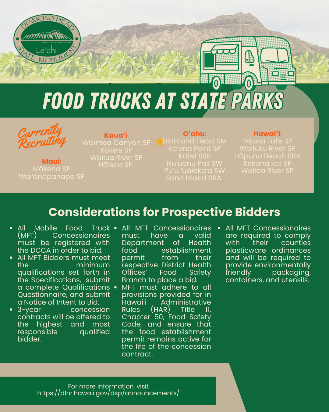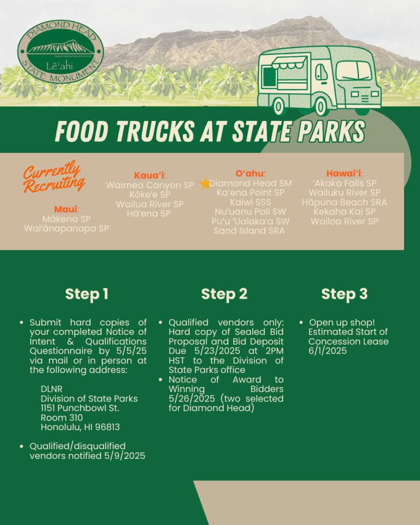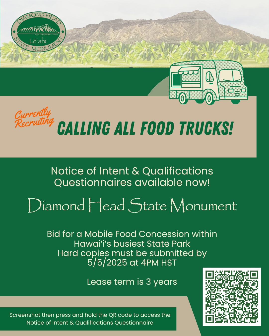Diamond Head (Lē‘ahi) is one of Hawaii’s most iconic geological features and a significant natural, cultural, historical, and recreational resource. The State of Hawai‘i Department of Land and Natural Resources, Division of State Parks (State Parks) is proposing improvements to the Diamond Head State Monument in an effort to enhance the visitor experience in and around the crater. Your input is valued, and we would love to hear from you!