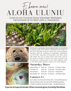 We are carrying forward this mission by extending ʻike niu (coconut knowledge). We aim to bridge the gaps in Hawaiian coconut research as well as practical knowledge of coconut production in Hawai‘i. This project is dedicated to rejuvenating Hawaiian coconut resources. We have a strong focus on reviving the Uluniu system, the Hawaiian niu gene banking practice, within our Hawaiʻi communities.