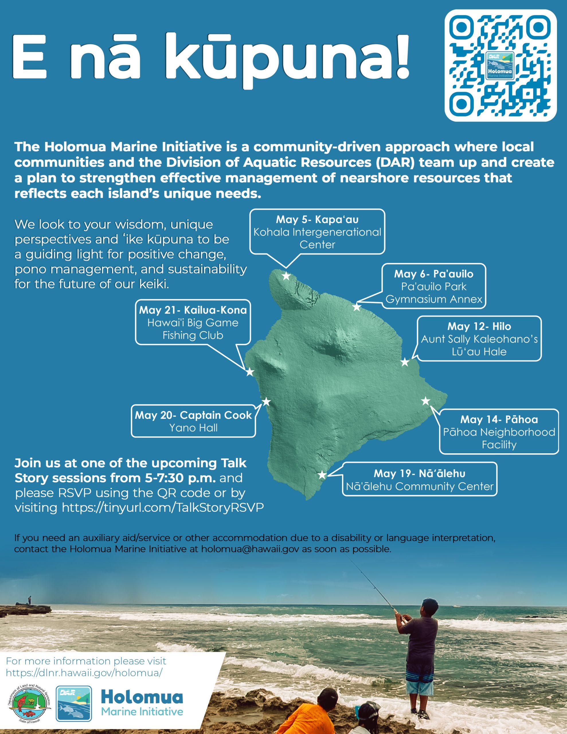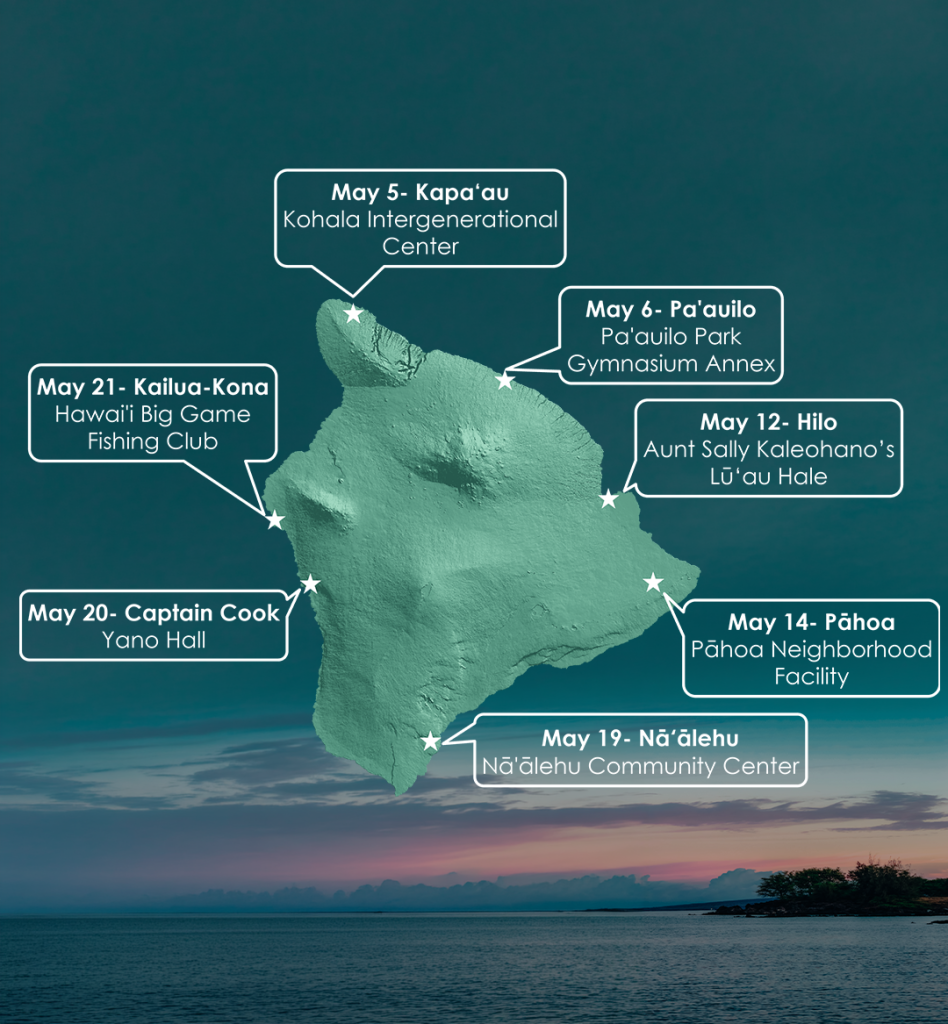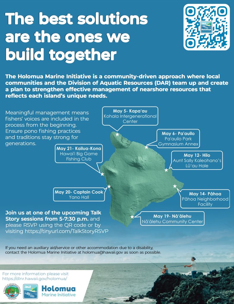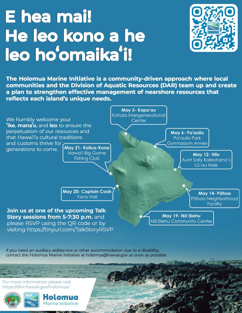 All Hawai‘i Island residents are invited to share their manaʻo and help shape management solutions tailored to their communities’ needs. Community input is vital, as local experiences and traditional knowledge will directly guide the sustainable future of our nearshore resources. Sessions will be hosted at the following locations, as seen in the picture, from 5:00 – 7:30 pm, doors open at 4:30 pm. RSVP at https://dlnr.hawaii.gov/rsvp-for-holomua-talk-story/