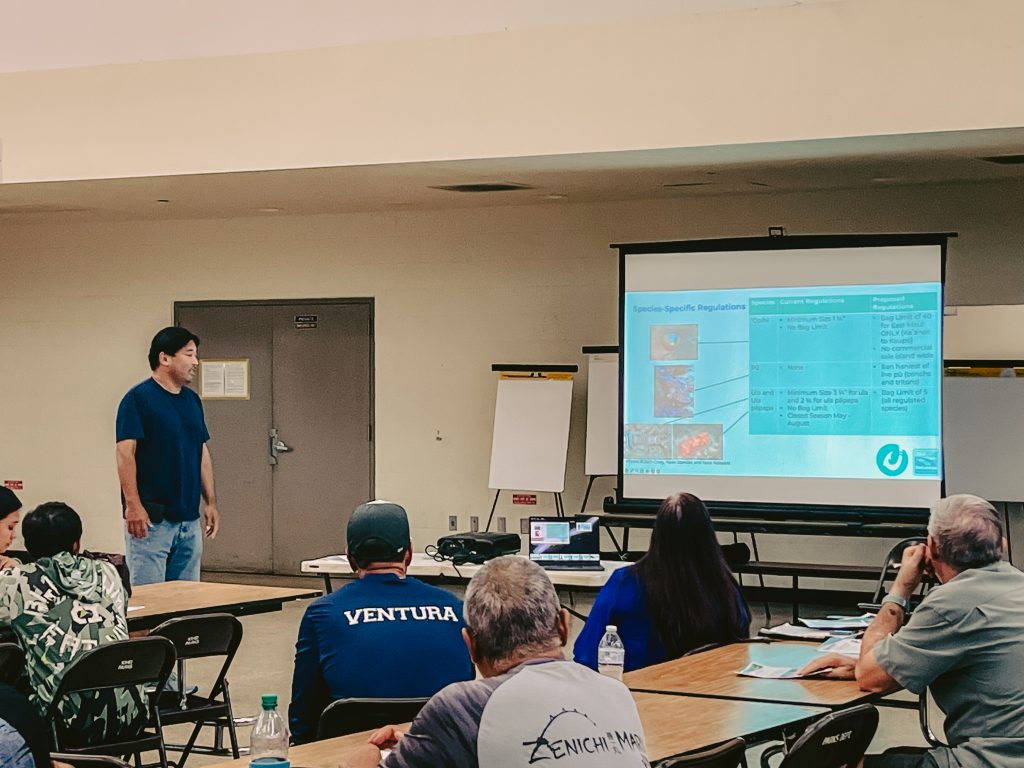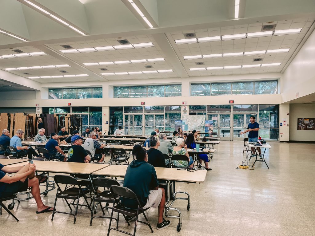 Fishers, cultural practitioners, and ocean users gathered at Helene Hall on September 24, 2024 to hear the Maui Navigation Team’s draft nearshore management recommendations. After the Navigation Team’s presentation, a collaborative forum for dialogue and conversation was opened where the community members in attendance could share their manaʻo and feedback.
