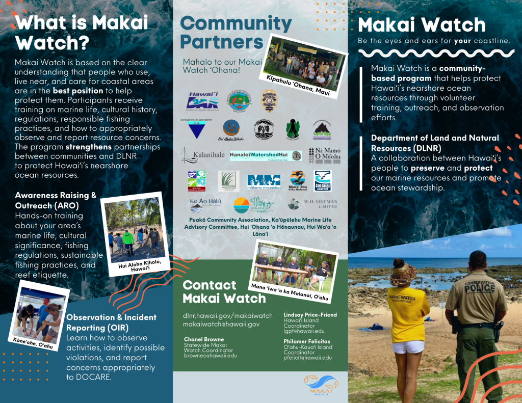 Community-Based Monitoring (CBM) is a way for local communities to track and build a holistic understanding of the health of the places and resources they care about, such as fish, limu, water quality, and how people use an area. CBM work is led by the community, with members deciding what to monitor, how to do it, and how the information is used, connecting data directly to community knowledge and supporting informed decision making. The Kōkua Community-Based Monitoring Program supports these efforts by working alongside communities across the pae ‘āina, with the Division of Aquatic Resources and partners providing guidance, tools, and technical support to help communities design and carry out their own monitoring, build local capacity, and use the information collected to guide management decisions for nearshore resources.
