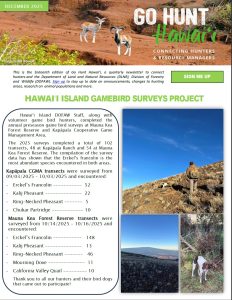 Go Hunt Hawai‘i is a newsletter available from the Department of Land and Natural Resources, Division of Forestry and Wildlife. Download our editions below, and sign up to stay up to date with our hunting-related announcements, news and to receive future editions.