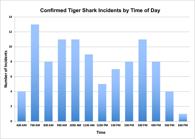 2. Stay out of the water at dawn, dusk, and night, when some species of sharks may move inshore to feed. But be aware that tiger sharks are known to bite people at all times of the day. (See graphic below.)